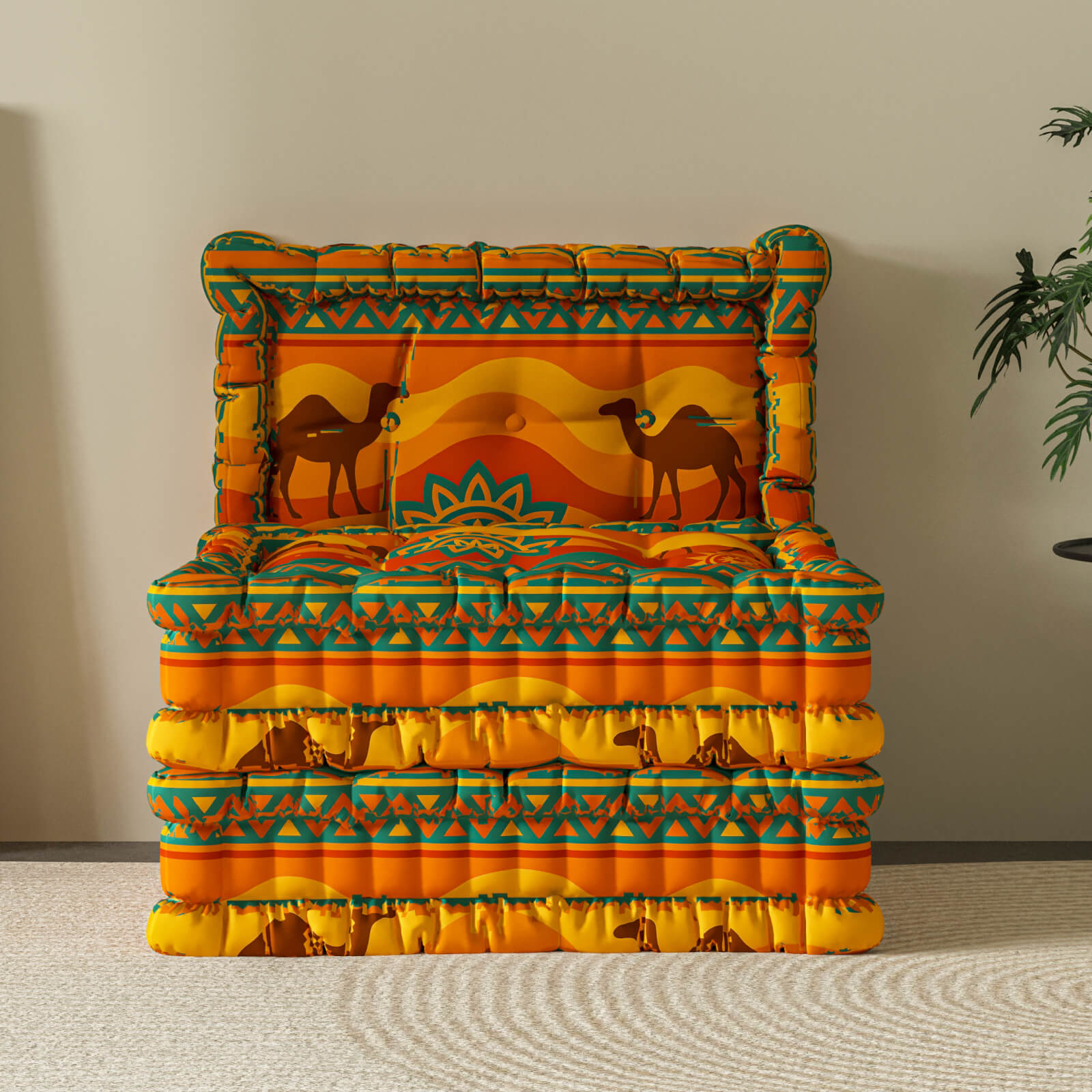 Outer Layer: Luxurious velvet polyester fabric with intricate desert camel silhouettes with geometric triangles, stripes, and mandala accents, inspired by African-inspired design. The soft-touch finish provides warmth in winter and breathability in summer.
